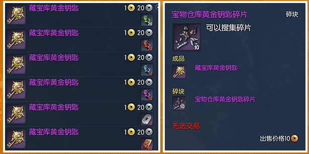 除商城购买外,可以在飞龙工商使用材料+1金20银兑换藏宝库黄金钥匙,也可以使用10个钥匙碎片来合成藏宝库黄金钥匙。