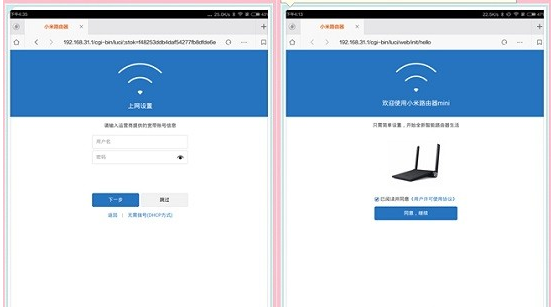 第三步,在上面连接上路由器后,如果是第一次连接,手机或者平板会自动用浏览器打开路由器的设置页面,如果没有自动打开,大家可以用手机或者平板的自带浏览器输入192.168.31.1打开相应的页面。