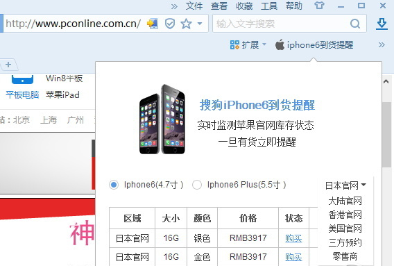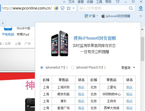搜狗抢iPhone6神器可以监控iPhone6和iPhone6 Plus(6+)的各大版本的库存情况。