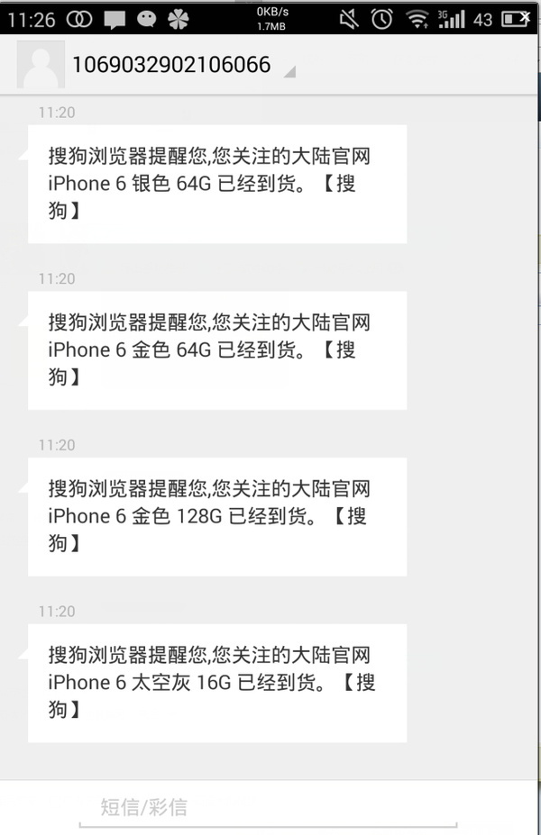 搜狗抢iPhone6神器的功能很简单,那就是帮你24小时全天候监控苹果官网上的iPhone6国行港行日版美版的库存情况,一旦到货就马上发N条短信通知你。