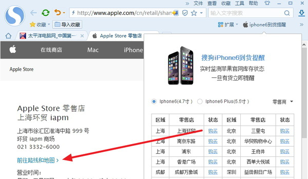 搜狗抢iPhone6神器还有一个温馨贴心功能是,告诉你中国各大苹果直营店在哪……