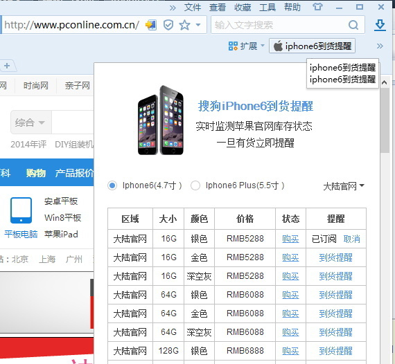 根据小编的研究,除了搜狗浏览器之外,拥有类似抢iPhone6神器的到货短信提醒功能插件的浏览器还有360和猎豹浏览器。对iPhone6有购买欲望的朋友可以去下载对应的插件研究一下。