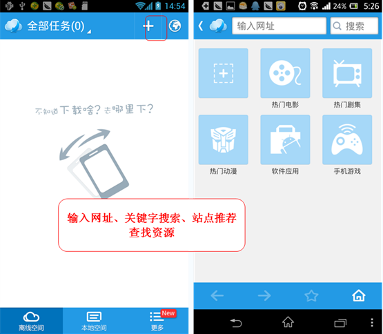迅雷离线的查找资源功能也非常强大。在主界面的右上角有个浏览器图标,点开有输入网址、关键字搜索、站点推荐等3种查找视频的方式。用户可以输入网址链接,也可以输入搜索的关键字查找想看的视频,而站点推荐则有热门电影、热门剧集、热门动漫、软件应用、手机游戏的推荐,也可以添加自己喜欢的站点。不管哪一种方式,都可立即云播放想看的内容,无需等待,不用下载。