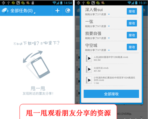 尝试“甩一甩“功能,你会发现,摇出来的视频基本都是热门的电影片、电视剧和电视节目,看来用迅雷离线的网友有不少影视迷,如此简单方便的“手机看片神器”,相信也是每一个爱看影片的人必备的手机应用!