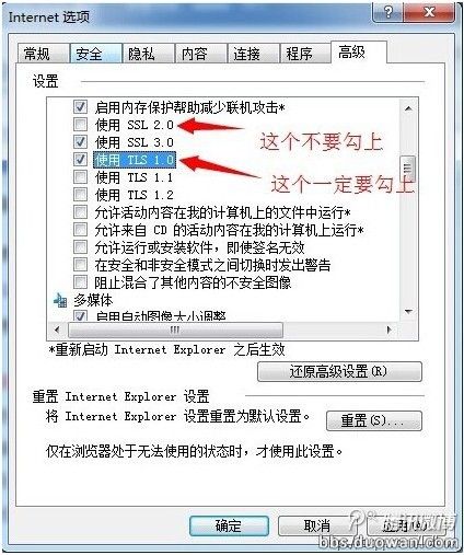 除上面提到的方法可以解决之外,我们发现某位撸友提供的方法(改动一下IE浏览器的设置)也可以解决。IE浏览器上方点击“工具”-“Internet选项”-“高级”,然后按照图片说明操作之后即可解决问题。