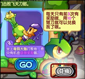 成功挑战并击败它,我们还需要再玩一个小游戏,点击图中的奇丽花大炮发射炮弹干掉螳螂!就可以获得螳螂臂刀。