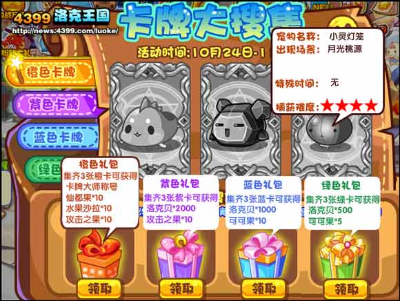 2、根据面板提示,挑战对应卡牌上的宠物。即有机会获得珍藏卡片,集齐卡牌则可100%领取绝版大礼!卡牌有四种,分别是橙色卡牌、紫色卡牌、蓝色卡牌、绿色卡牌