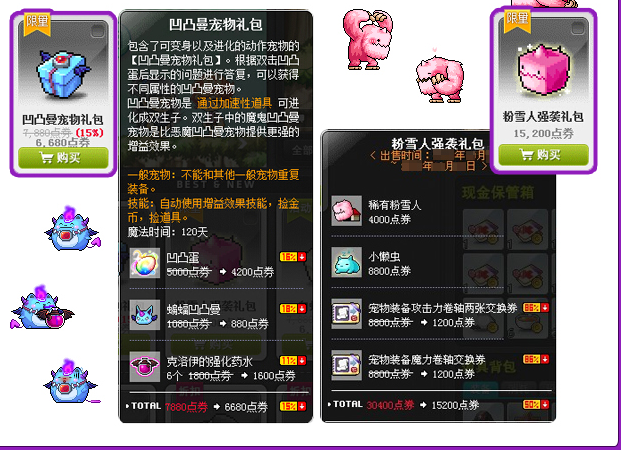 首页 → 最新资讯 → 游戏要闻 → 冒险岛凹凸曼宠物礼包介绍 粉雪人强袭礼包绿喵喵礼包