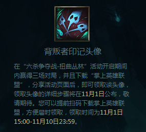在“六杀争夺战-扭曲丛林”活动开启期间内赢得三场对局,并且下载“掌上英雄联盟”,分享活动页面后,即可领取该头像,领取头像的详细步骤将在11月1日公布,敬请期待。您可以提前扫码下载掌上英雄联盟,方便届时领取,领取时间为11月1日15:00-11月10日23:59。