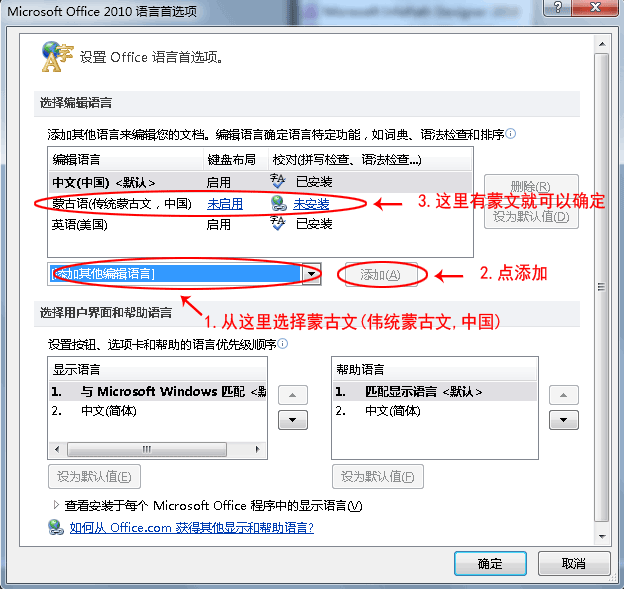 按上面红色标记的顺序选择,第一步:选择蒙古文,第二步选择“添加”,这时出现第三步里面的蒙古文选项。这时可以按“确定”按钮。