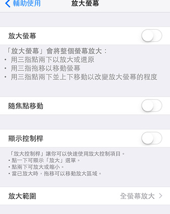 设定十分简单,在设定 App 之中按设置→通用→辅助功能→放大屏幕,然后启动放大屏幕。如果出现放大界面,在放大范围设定全屏幕放大就可以了。