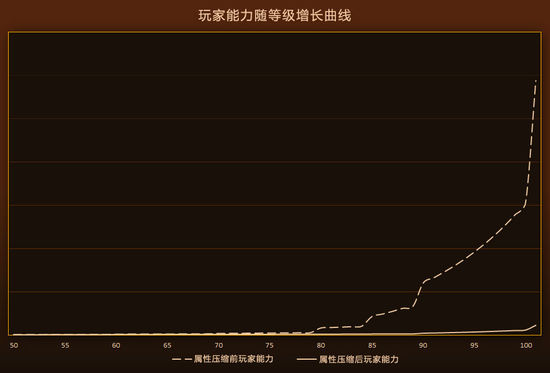 上图大概显示了各个等级怪物的生命值成长曲线。玩家的装备成长,随之而来的就是怪物生命值的飙升。虚线表示压缩之前的生命值,可以看到每一部新资料片怪物的血量都有大幅提升。假如《德拉诺之王》再不压缩,就会突破天际。