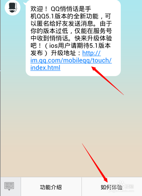 第六步:接下来点击对话框下面的如何体验。这个时候就会有系统消息发过来,看看是如何升级激活qq悄悄话功能的介绍。
