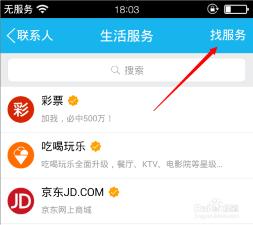 第二步:接下来再点击生活服务右上角的找服务功能。假如你已经使用过悄悄话功能,他就会在这里出现,假如没有,只能按下面的方法去找。