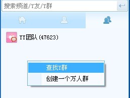 打开YY窗口,选中“Y群”项,在“Y群”面版空白处,点击鼠标右键,选择“查找添加群”,如下图所示,此时系统弹出“查找群”对话框。