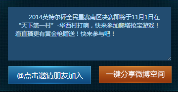 2014英特尔杯全民星赛南区决赛即将于11月1日在“天下第一村”-华西村打响,快来参加爬塔抢宝游戏!看直播更有黄金枪赠送!快来参与吧!