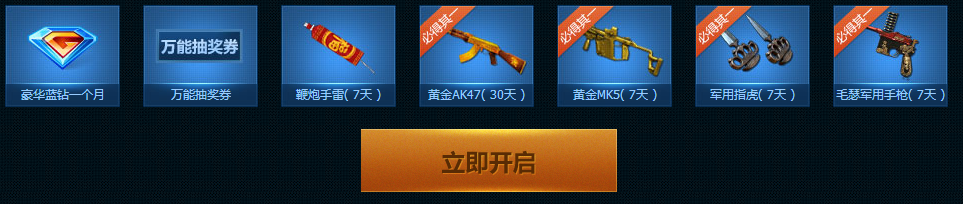 您可以支付15QB开启华西村专属礼包,领取鞭炮手雷7天+万能楼层抽奖券1张(可用于抽任意楼层)+极品武器(必得其一中四选一)!30天黄金AK47等着你!