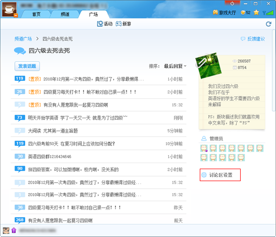 广场的讨论区相当于论坛版块,话题相当于贴子。频道管理员(OW) 、频道总管理(VP)拥有创建讨论区的权限。
