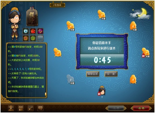 每局游戏开始时,系统自动分发身份牌,分别为捕快,杀手,平民。