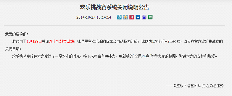 游戏内于10月29日关闭欢乐挑战赛系统,账号里有欢乐币的玩家会自动换为经验,比例为1欢乐币=2点经验,请大家留意欢乐挑战赛的关闭日期。