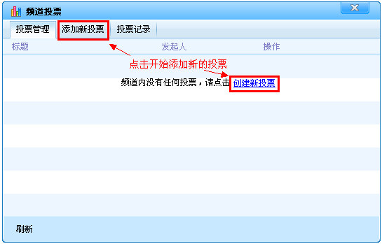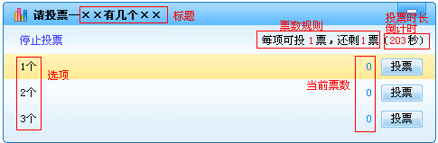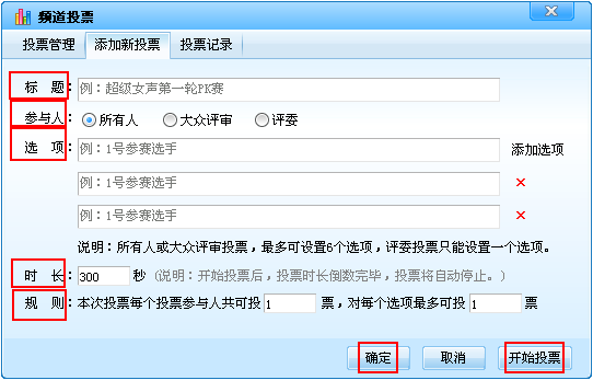 点击【开始投票】,立即开始此投票,同时,该投票也被添加到了管理列表中。如果本频道有投票正在进行,则不能立即开始投票,此投票会被添加到列表。