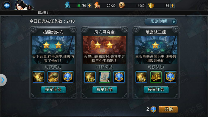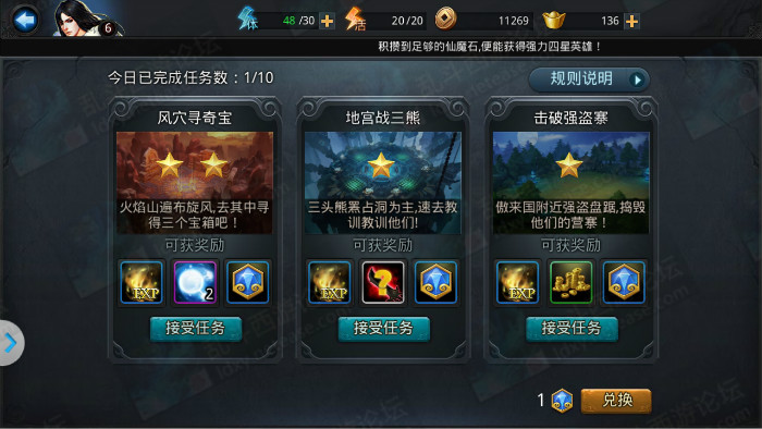 2、选择你要接受的任务。每次会刷新3个不同的任务可选,每天可进行10次,不能购买额外次数。