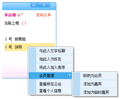 同样,鼠标右键点击幸运榜里的中奖用户也可以呼唤出该操作菜单