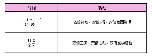 11.1-11.2每天14-16点期间将为大家开启双倍经验、双倍G币、双倍舞团资源活动。11月2日全天将开启双倍工资、双倍心动、双倍宠物经验活动。