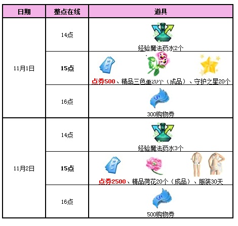 11月2日15点整点在线即可获得2500点券,另有30天精美套装逞娇呈美/泳坛王子等您拿。