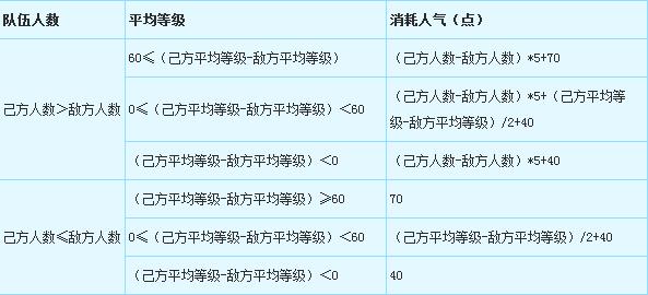 调整前消耗:((己方人数-敌方人数)*5+20)点人气