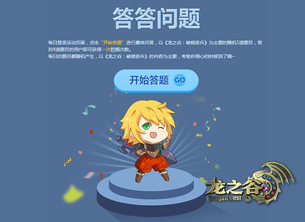 谷迷玩家们只要登录活动页面,点击“开始答题”,以《龙之谷:破晓奇兵》为主题的5道随机题目,只要答对4题就能获得一次挖掘次数了哦。快快去看《龙之谷:破晓奇兵》吧,很多题目都涉及到了一些细节哦!