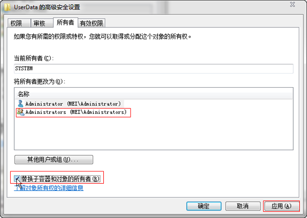 (3)在“所有者”选项卡中,选定“Administrators”,勾选“替换子容器和对象的所有者”,点击“应用”,将“当前所有者”更改为“Administrators”。