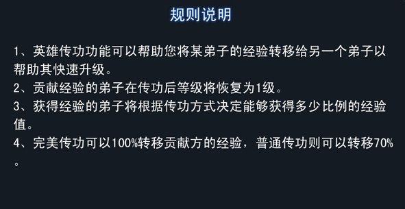 1.“英雄传功”功能可以帮助您将某弟子的经验转移给另一个弟子以帮助其快速升级!