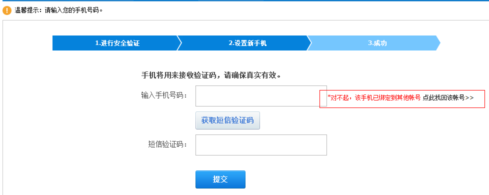 3、填写您所要绑定的手机号码,点击“获取验证码”,正常情况下即可绑定成功,如提示您的手机已绑定其他账号。如图所示: