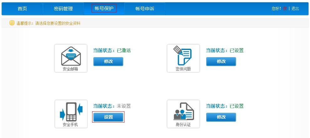 3、未绑定的安全资料可以点击页面上方”帐号保护“按钮,点击”设置“