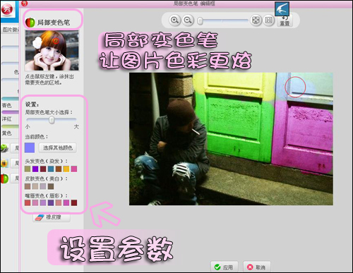在“图片处理”标签下,有局部变色笔,可以自定义喜欢的颜色,涂抹就OK了。