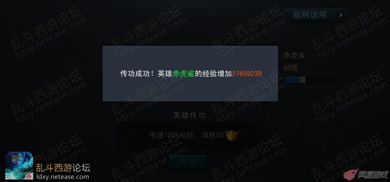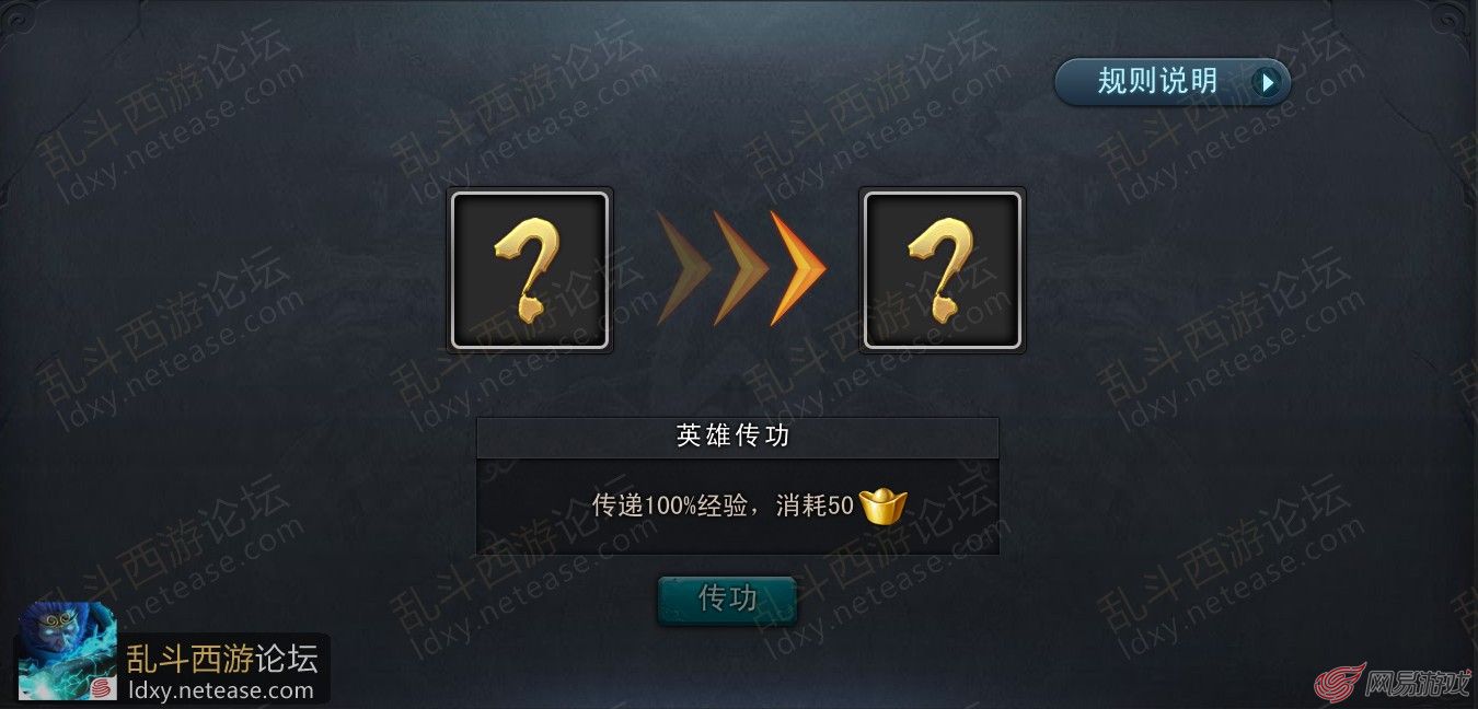传功:类似吞噬系统,将老英雄的经验传到新英雄身上,使得后续获得英雄不必重新练级。
