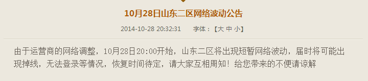 由于运营商的网络调整,10月28日20:00开始,山东二区将出现短暂网络波动,届时将可能出现掉线,无法登录等情况,恢复时间待定,请大家互相周知!给您带来的不便请谅解