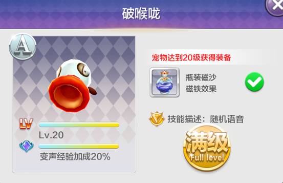 破喉咙可不是只会给你趣味声音体验的小丑哦,当它被升级到20级时,会贡献出本命装备A阶【瓶装磁沙】,赋予角色形影不离的磁铁效果,让你再也不用担心吃不完收集物拉,妈妈再也不用担心你的强迫症,是不是很爽呀,快来试试吧!