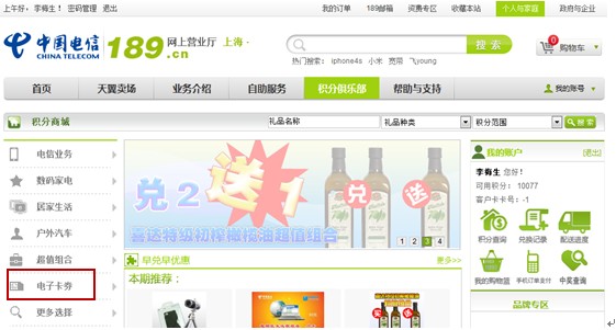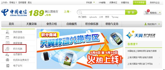 二、登录网厅,使用电信积分兑换串码1.1.1登录上海电信网上营业厅(sh.189.cn),并选择“用户登录”。