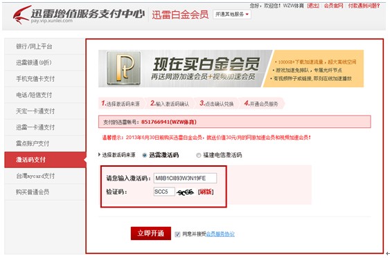 2.2用户打开激活码支付页面,正确输入串码以及验证码,选择“立即开通”(未在迅雷进行过手机绑定的用户,须要将迅雷帐号绑定手机)。