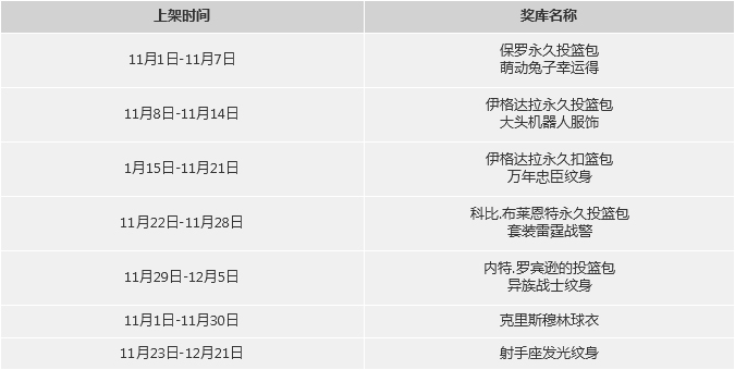 11月10日0:00-11月23日24:00:T.普林斯的投篮包、M.威廉姆斯的投篮包、C.巴特勒的投篮包、M.世界和平的投篮包、M.比斯利的投篮包、J.麦基的扣篮包、C.卡曼的靠打包