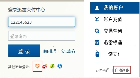 3、如果在支付中开通了自动续费,可以在PAY.XUNLEI.COM中的解绑,登陆时通过支付宝账号进行联合登陆。