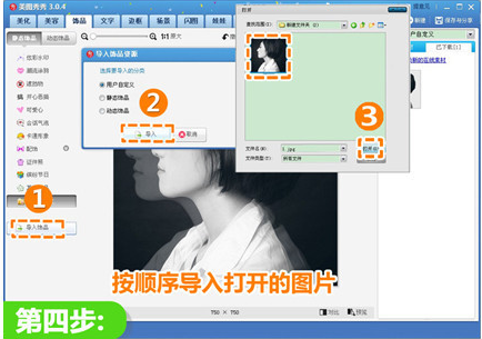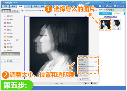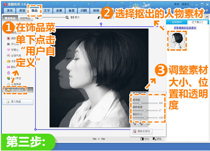 3、在“饰品”菜单下点击“用户自定义”,选择之前抠出的人物素材,设置素材大小为104%、透明度30%,放置于脸部较前的位置。