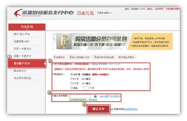 确认无误后请输入支付密码点击【确认支付】按钮=》支付成功后即可开通迅雷会员。