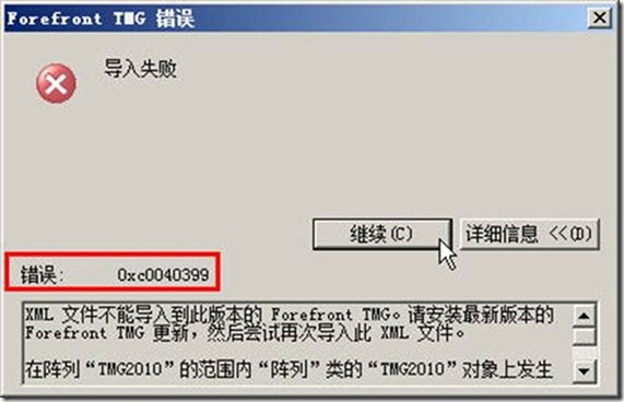 如果你在卸载Forefront TMG之前,已经导出了Forefront TMG的配置信息,但在重新安装Forefront TMG之后,提示错误“0xc0040399”的信息,如图2-4所示。