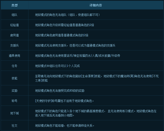 玩家账号内有一个85级的满级角色则可以创建地狱模式角色(无法创造缔造者/黑暗武士职业的地狱模式)。地狱模式角色每天只能创建一次(创建次数每日凌晨6:00重置)。