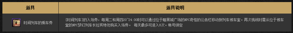 活动期间,玩家在每周二和周四第一个登录的角色可以获得一张【时间列车的乘车券】。