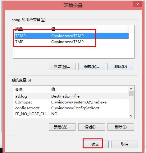 5、如下图,请找到环境变量内的的“TEMP”和“TMP”,并把里面的路径改成:C:windowsTEMP 然后点击确定,再进行安装尝试。