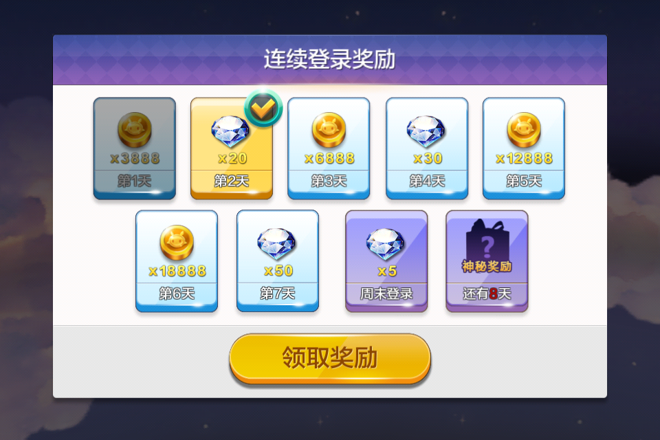 1、从注册当日起,每日连续登录,即可领取一定额度的金币或钻石奖励,连续登录的天数越多,获得的奖励越丰厚!